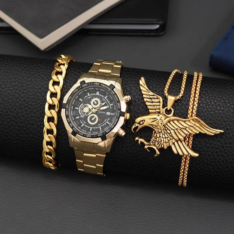 3PCS Set Luxury Fashion Mens Watch Necklace Bracelet Set