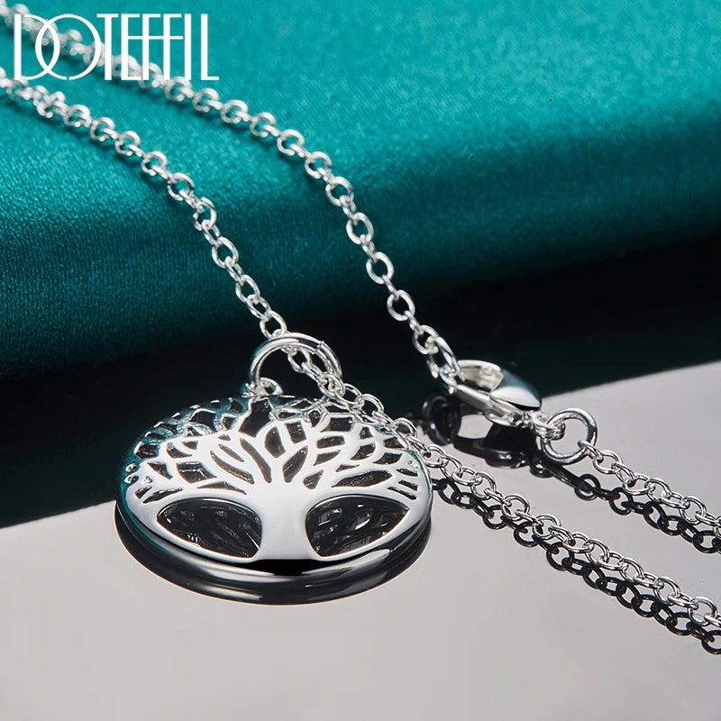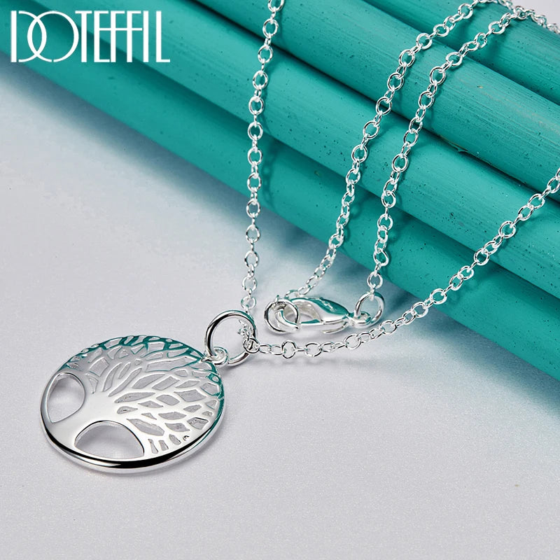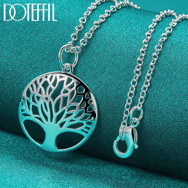 925 Sterling Silver Chain Tree Round Pendant Necklace For Woman