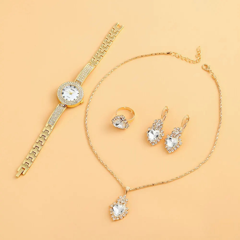 Dainty Quartz Watch With Necklace Earrings Ring Set