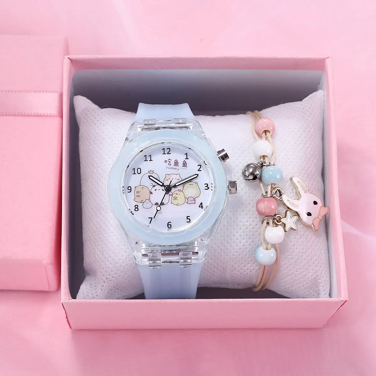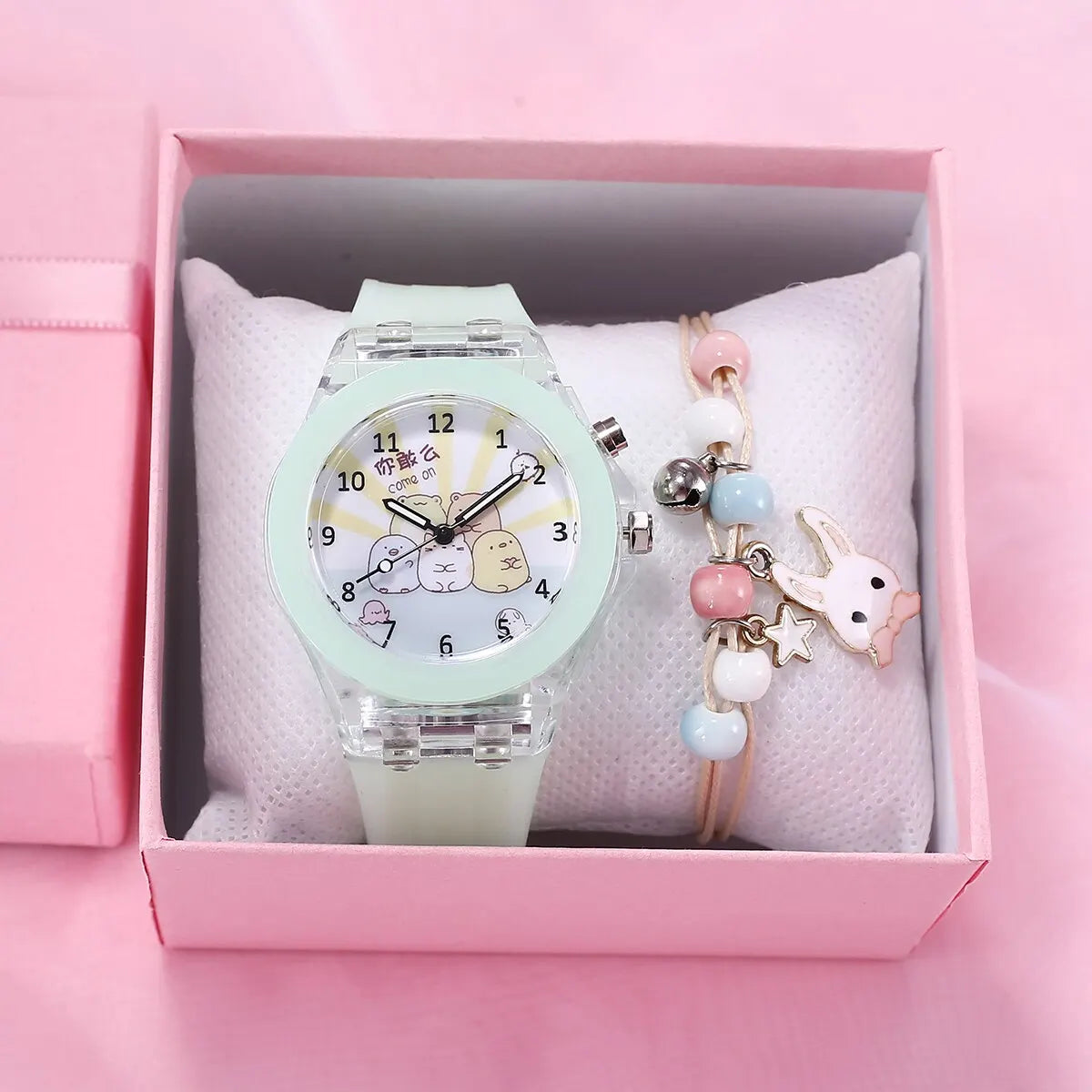 Women's fashion luminous silicone quartz watch + simple four-leaf clover bracelet 2pcs/set